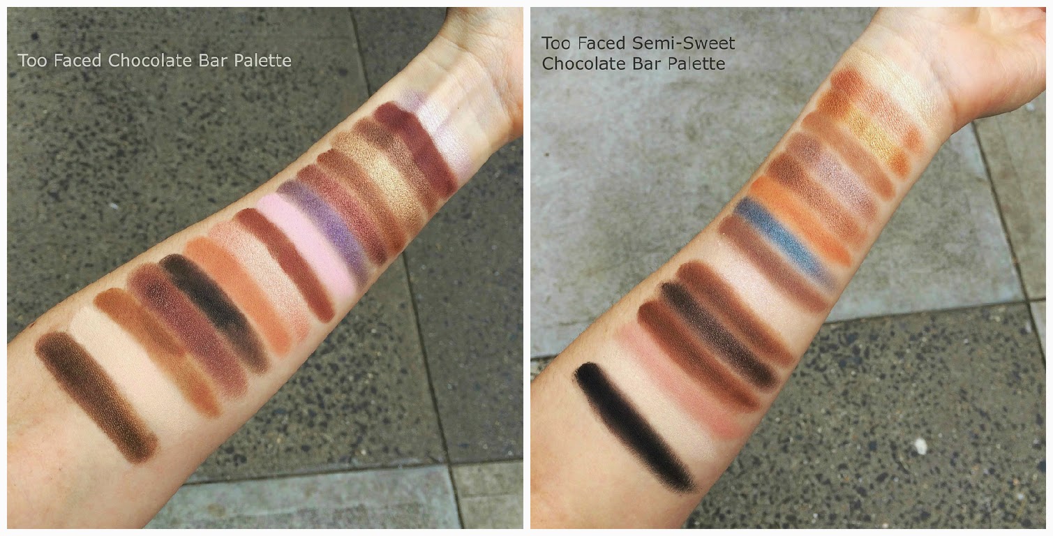 As you can see the palettes are not entirely dissimilar, there are a lot of neutral colours in each palette. Judging by the swatches above I would say the original Chocolate Bar Palette is in fact warmer than the Semi-Sweet. The Semi-Sweet Chocolate Bar also appears to have more shimmers and brighter, stand-out shades, namely Blueberry Swirl, Caramel and Bon Bon. Blueberry Swirl does look like a lovely rich shimmering teal in the palette, a stunning colour but swatched it is quite disappointing and unexpectedly ordinary.