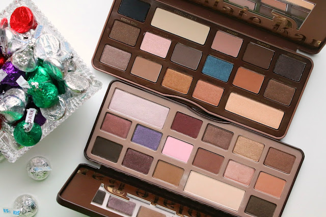 Let me begin by saying that I don’t own either palette largely because I have far too many eyeshadow palettes that boast similar shades. However, I have some other Too Faced Palettes such as the Natural Eye Palette and the quality of the shadows are consistently good, not my favourite but still pigmented, blendable and soft with minimal fallout. Both of these palettes have similar quality shadows. See swatches side-by-side below.