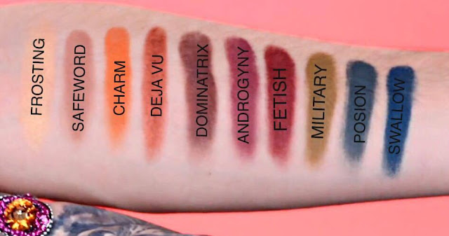 The bottom row contains a few pops of colour and these five shades are: Androgyny (matte perfect plum); Fetish (deep dark metallic red); Military (matte camo/military green); Poison (matte teal green) and Swallow (a vibrant dark blue matte). In total, there are 3 metallic shades and 7 mattes.