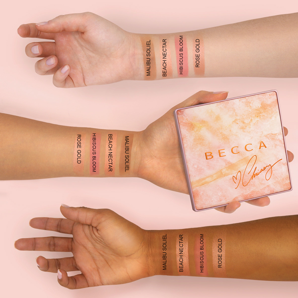 Onto the inside of the palette. There are the two shimmering skin perfectors: Beach Nectar which is a brand new apricot gold and Rose Gold, the pre-existing subtle gold with rose undertones. There is also a brand new blush and bronzer created by Chrissy Teigen. The Luminous Blush is called Hibiscus Bloom and is a bright golden pink coral . The Sunlit Bronzer in Malibu Soleil is described as a medium amber hue designed to mimic the warmth of a beach tan. You can see swatches below:
