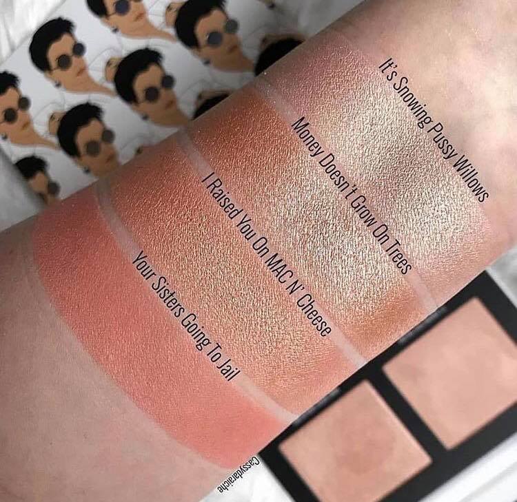 On the other hand, in the cheek palette the three highlights all seem to be of a similar quality, very alike to Kylie’s original powder highlighters, basically pretty but not amazing. It’s Snowing Pussy Willows is a beautiful light gold champagne shimmer, Money Doesn’t Grown on Trees is a warm champagne shimmer which reminds me of Becca’s Prosecco Pop and I Raised You on Mac ‘n’ Cheese is a beautiful coral highlight which would work well as a blush topper as well as a highlight for deeper/olive skin tones. Last in the palette is the blush shade Your Sister’s Going to Jail representing an iconic moment on KUWTK this is the perfect peachy coral blush that suits all skin tones. In Jaclyn’s review the blush had next to no pigment whereas Katy from Lustre Lux didn’t experience any problems, I think it is important to use a stippling or buffing brush with this blush as you want to make sure you don’t lose the product. It also appears quite powdery you can see the dust billowing off Jaclyn’s cheeks in her video when she is packing it on.