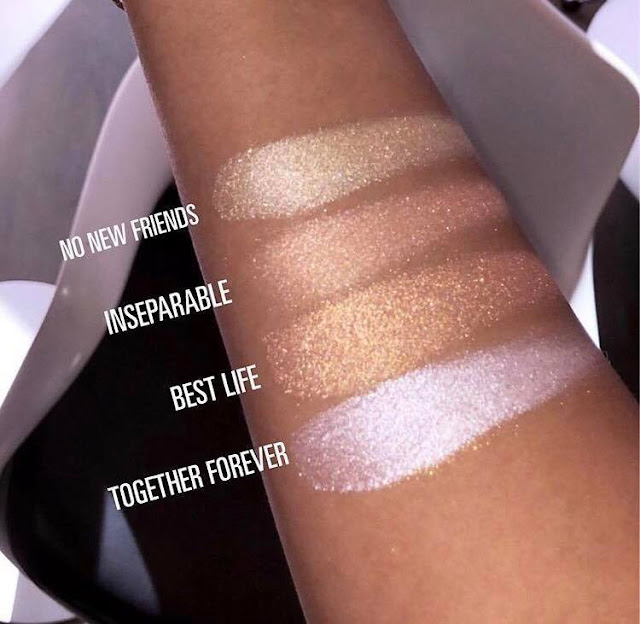 From the swatches below, cute names by the way, these highlighters seem to be the really intense almost glittery kind of highlighters. For me, personally, they are not the highlighters that work best for my skin, but if you do like a blinding highlight and want one palette with a few different options this could be a great palette for you. If you are on a budget, I recommend checking out the Sleek highlighter palettes and maybe the Sophx Makeup Revolution highlight palette. Together Forever looks like a really interesting shade, with lilac pink undertones that can be beautiful on a lot of skin colours. No New Friends appears to be another universal highlight, a traditional champagne gold, Inseperable is a warmer peachy gold shimmer and Best Life is almost a rose gold highlight.