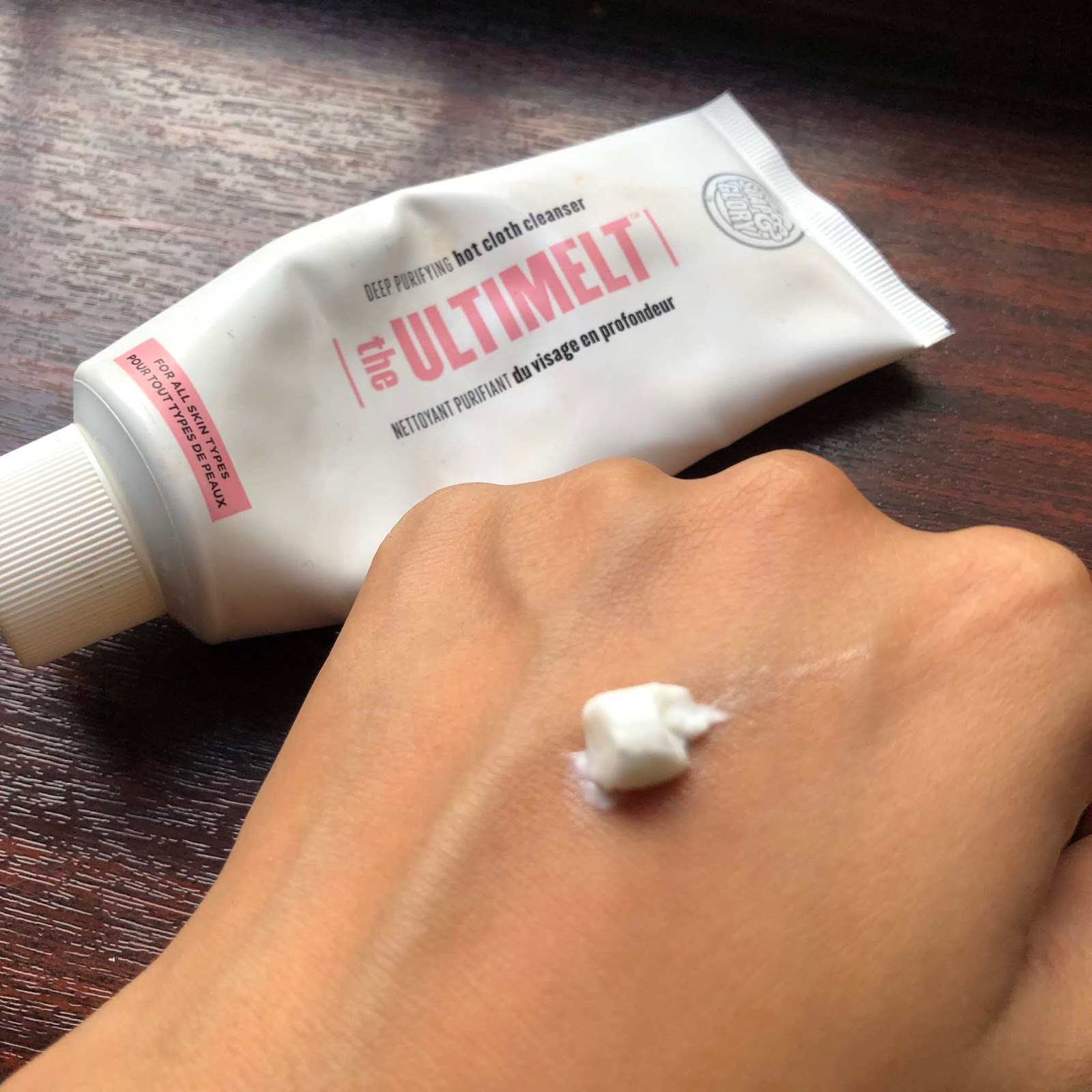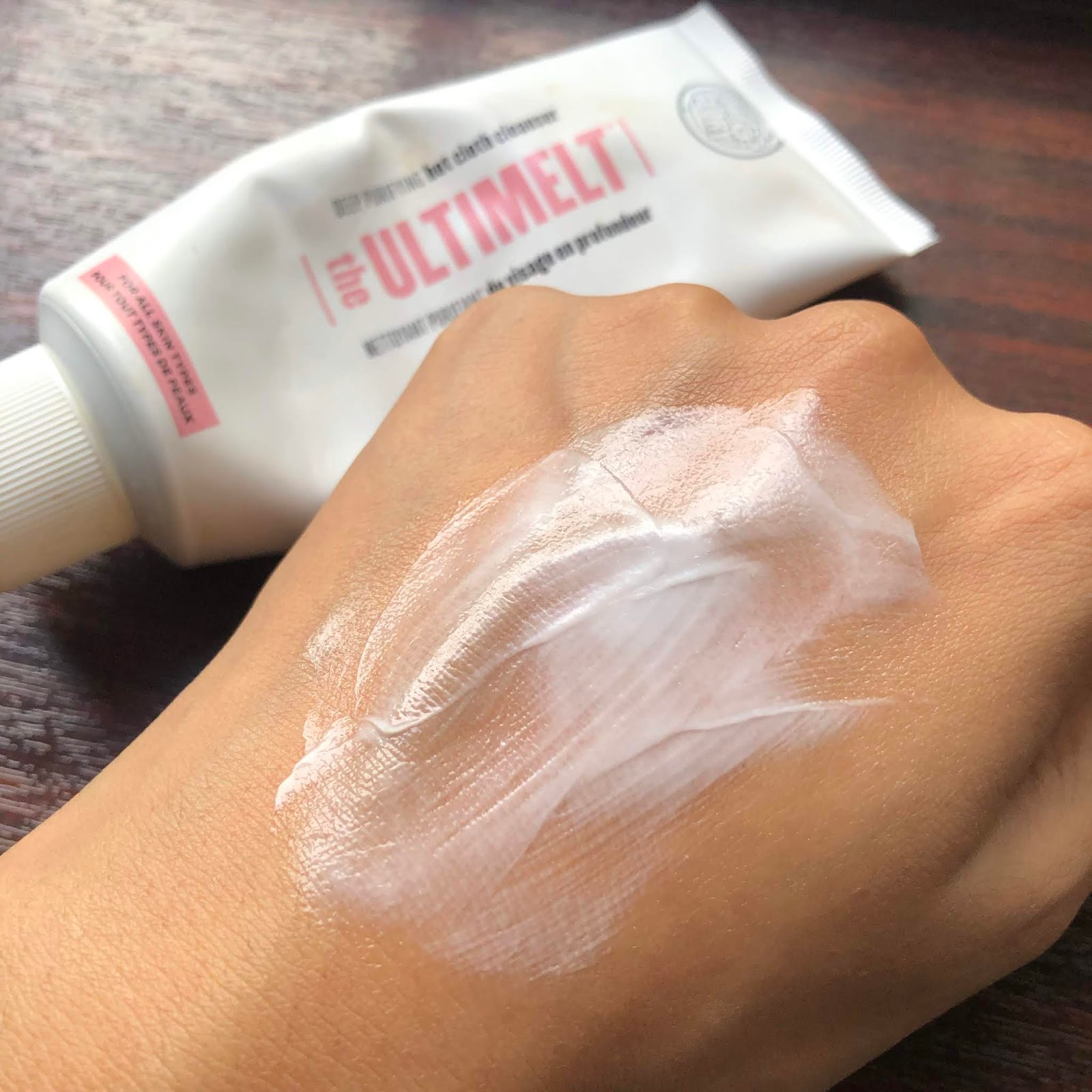 The Ultimelt contains orange, lavender, clary sage, rose and geranium oils along with cocoa seed and sweet almond butter oils, which taken together sound like actual heaven. Full list of ingredients here: Aqua (Water/Eau), Caprylic/Capric Triglyceride, Theobroma Cacao (Cocoa) Seed Butter Oils, Glycerin, Cetearyl Alcohol, Cetyl Esters, Sorbitan Stearate, Polysorbate 60, Synthetic Beeswax, Phenoxyethanol, Caprylyl Glycol, Prunus Amygdalus Dulcis (Sweet Almond) Oil, Panthenol, Disodium EDTA, Lavandula Angustifolia (Lavender) Flower Oil, Linalool, Citrus Aurantium Amara (Bitter Orange) Leaf Oil, Pelargonium Graveolens Flower Oil, Pantolactone, Salvia Sclarea (Clary) Oil. It is recommended to apply a grape sized amount and work it over your face for at least 2 minutes. Truthfully, I will massage it onto my face for around 60 seconds and that seems like more than enough time for me.